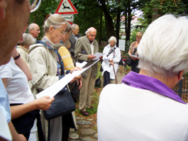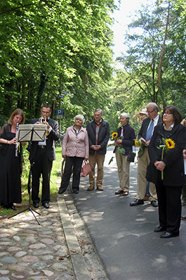 Nach dem Gottesdienst erinnerte eine Gedenkfeier am Mahnmal im Grotiusweg an die Geschichte des Hauses und seine damaligen Bewohner.