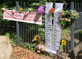 mit ihrem Namen wurden zusammen mit Blumen am Zaun des Grundstücks befestigt.