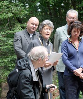 In Vertretung des Vorsitzenden Dr. Martin Schmidt richtete Prof. Friedemann Hellwig das Wort an die vor dem Grotiusweg 36 (früher Steubenweg 36) Versammelten. Er erinnerte an die Geschehnisse des 19. Juli 1942, an die Deportation der Bewohner dieses Hauses, das zuvor zum "Judenhaus" erklärt wurde in der Absicht, hier Menschen zusammenzupferchen, um sie leichter in die Konzentrationslager bringen zu können. Gedacht wurde auch derjenigen, die sich der anstehenden Deportation durch Selbsttötung entzogen hatten. Reihum verlasen die Versammelten die Namen der 17 Opfer. Schleifen mit ihren Namen und Lebensdaten, dazu Blumen markieren die Stelle des Verbrechens.